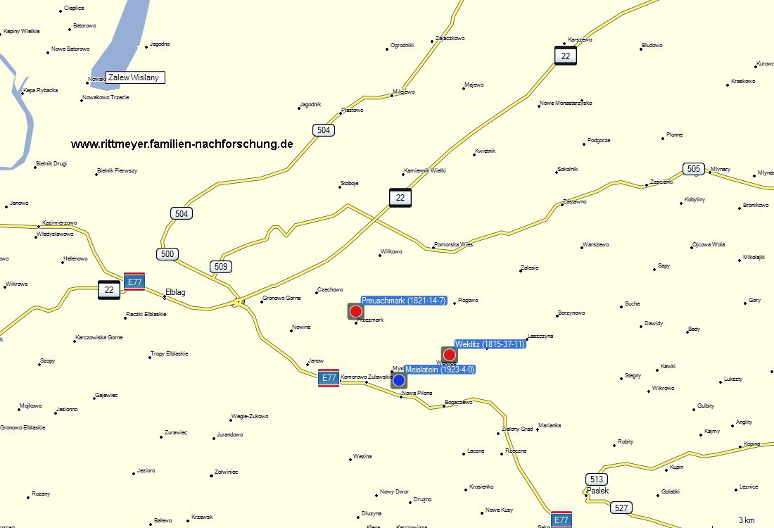 | Schwerpunkt-Region Raum Landkreis Elbing (Westpruessen), in der seit 1815 Geburten und/oder Sterbefälle der Familie Rittmeyer erkannt worden sind |