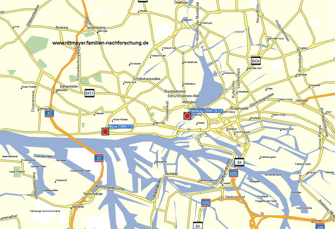 | Schwerpunkt-Region Raum Hamburg, in der seit 1884 Geburten und/oder Sterbefälle der Familie Rittmeyer erkannt worden sind |