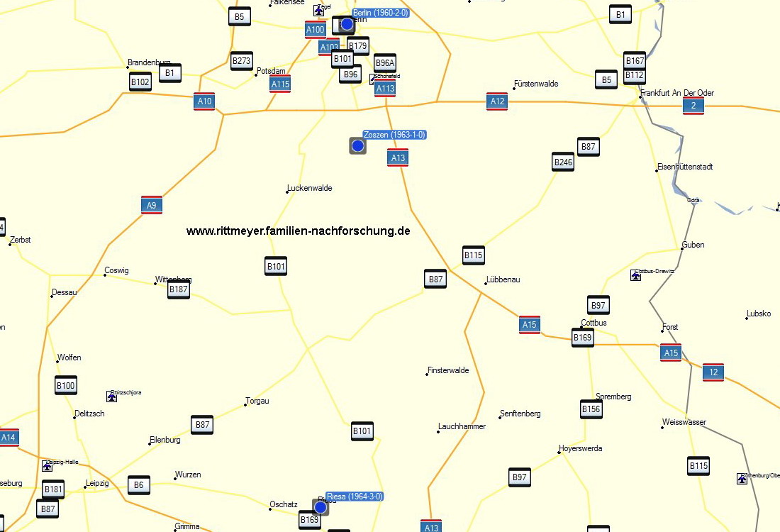 | Schwerpunkt-Region Raum Mitteldeutschland, in der seit 1960 Geburten und/oder Sterbefälle der Familie Rittmeyer erkannt worden sind |