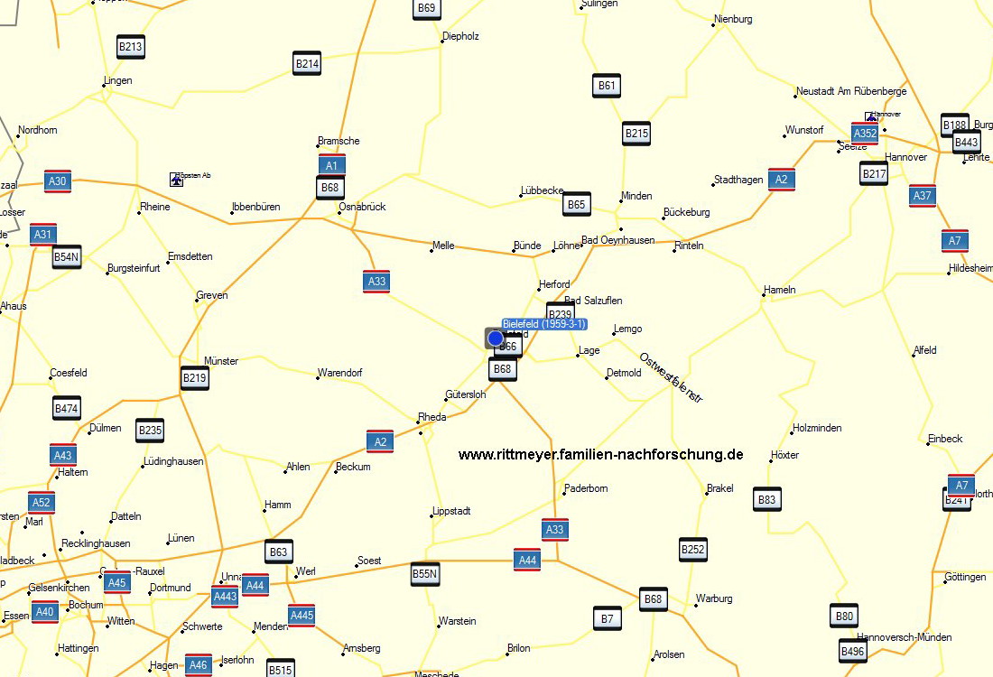 | Schwerpunkt-Region Raum Westfalen, in der seit 1959 Geburten und/oder Sterbefälle der Familie Rittmeyer erkannt worden sind |
