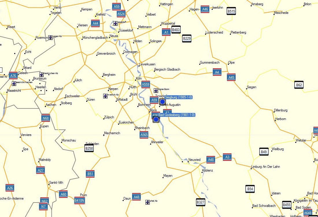 | Schwerpunkt-Region Raum Rheinland, in der seit 1981 Geburten und/oder Sterbefälle der Familie Rittmeyer erkannt worden sind |